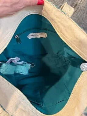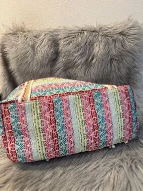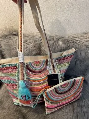 Multicolor embroidered tote bag with matching zip pouch. Vibrant patterned embroidery and textured trims create a standout look. Comfortable shoulder straps and a coordinating pouch keep essentials organized. Perfect for everyday use or travel with colorful style. In new condition.