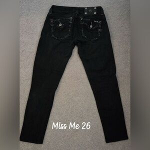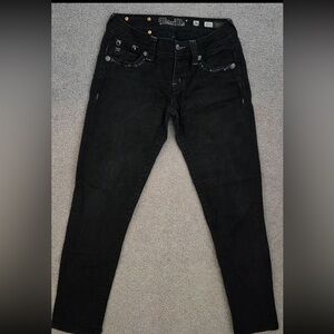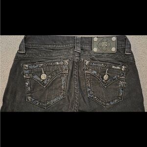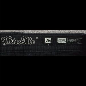 Sleek skinny silhouette from Miss Me. Black denim with subtle pocket embellishments. Stretch fabric for comfortable wear. Clean look suitable for casual or dressed-up outfits.