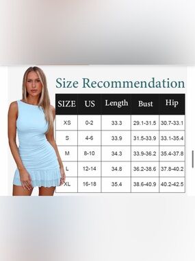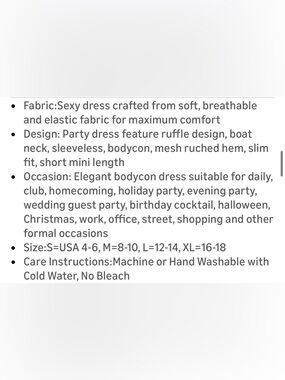 This dress is a sexy and slim fitted body con mini dress that is made from breathable and elastic fabric and is very flexible and comfortable. This dress includes a ruffle design at the skirt, has a mesh ruffed hem, includes a boat neck, & is sleeveless. No zippers. Great for daily wear, nights out, clubbing, cocktail hour, and other evening events. This dress is a size small and typically fits those that wear a US size 4-6. The dress can be machine, washed and hand washed, recommended with cold water and no bleach. I have only worn this dress once to a New Year’s event, I am 5’4 and 125 pounds & size 34C for reference, & the dress sits at the upper-mid thigh. It is super comfortable & I did not have any concerns for dress length all night :)