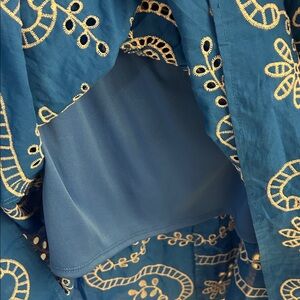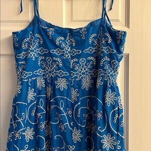 Strapless silhouette Bright blue eyelet fabric with white floral and paisley-inspired print. Knee-length, casual summer style. Easy, breezy look for daytime outings. Has lining , I never wore , it was tight in the chest and never got around to getting it to a tailor to try to fix .
