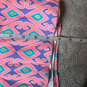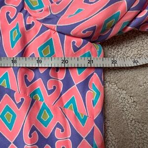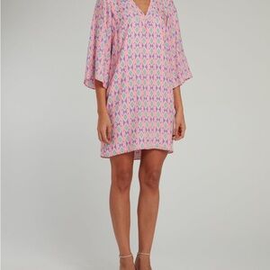 Bright pink shift dress with all-over geometric print. V-neckline and short sleeves. Lightweight, breezy silhouette. Bold turquoise and purple accents in the pattern.