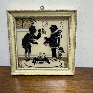 Vintage Reliance Framed Silhouette Picture Boy Girl Playing USA 4.5" Square Rare