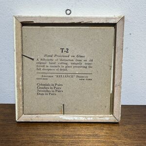 vintage framed silhouette Reliance features a charming scene of a boy and girl playing in the United States. The 4.5" square photo captures an antique style with original craftsmanship, making it a rare and unique piece for collectors or antique enthusiasts. Made in the United States, this silhouette picture is a special addition to any collection of vintage art or Americana decor.