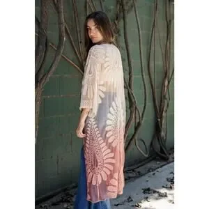 Womens Embroidered Ombre Lace Kimono Boho Sheer 3/4 Sleeve Rose OSFM 48x20