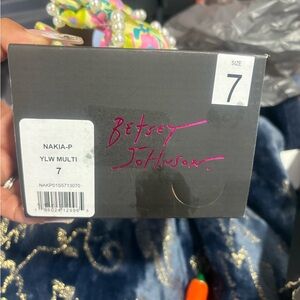 Vibrant floral slip-on sandals by Betsey Johnson. Padded bow with pearl trim. Open back and flat sole. Playful multicolor design.