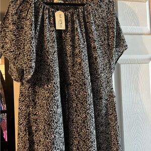 Black and white printed maxi dress with a relaxed, flowing silhouette. Short sleeves and a gathered tiered hem create soft movement. Lightweight, breathable fabric for easy all-day wear. Elegant monochrome print suitable for casual or dressy occasions. Size XL