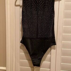 Black Sheer Silver Rhinestone Mock Neck Bodysuit new