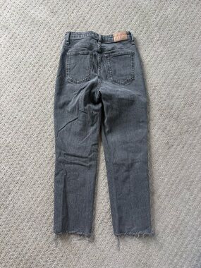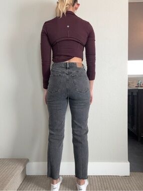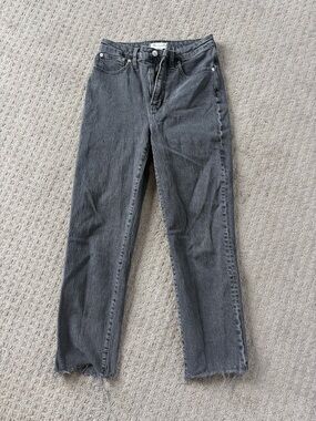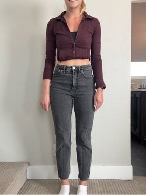 High-waist jeans with a washed black finish. Classic five-pocket styling. Zip fly and belt loops. Versatile everyday denim.