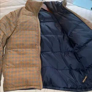 Classic Burberry plaid on a quilted puffer silhouette. Front zipper closure with high collar. Subtle insulated fill for warmth. Clean lines and cuffed sleeves. Versatile piece for layered looks. Jacket is reversible.