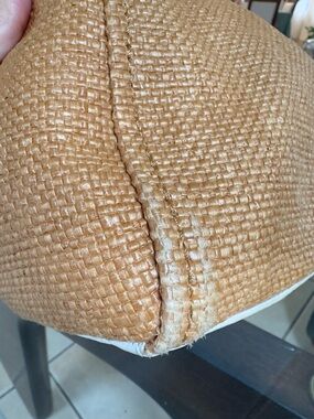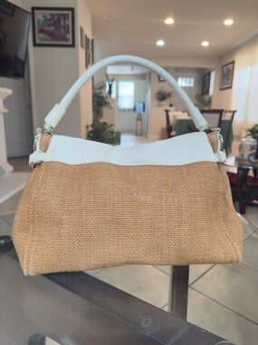 Kate Spade shoulder bag with a raffia tan body and white pebbled leather flap and shoulder strap. Single top handle and zip pocket on front flap.