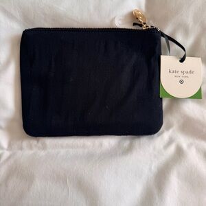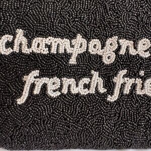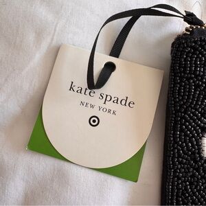 Kate Spade beaded pouch featuring white beaded lettering on a black background. Zip-top closure with decorative beadwork. Playful script adds whimsical charm.