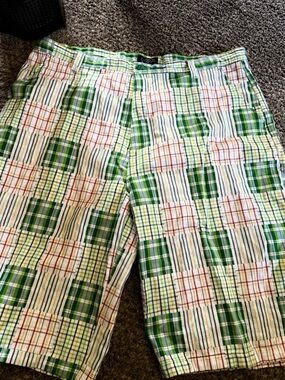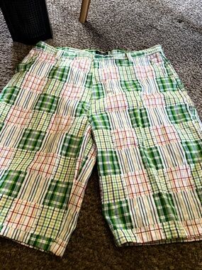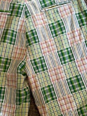 Casual plaid shorts in a green patchwork pattern. Features multicolored striped and checked blocks. Lightweight summer style. Versatile and easy to pair.