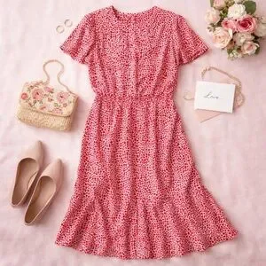 Eye-catching red and white printed midi dress by Joy Gordon featuring a flattering fit & flare silhouette. Designed with a classic round neckline, short sleeves, and a subtle back keyhole button closure for an elegant touch. Lightweight and flowy, perfect for spring, summer, or vacation wear.