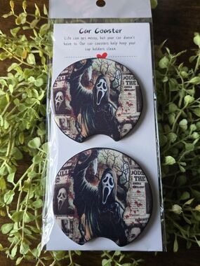 Set of two Halloween-themed car coasters featuring a ghost-face design. Durable, absorbent surface protects cup holders and reduces spills. Stylish black and brown artwork adds spooky flair to your vehicle.