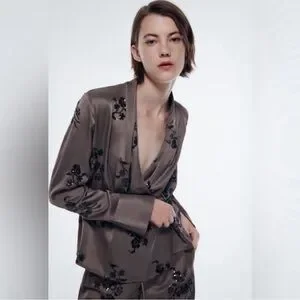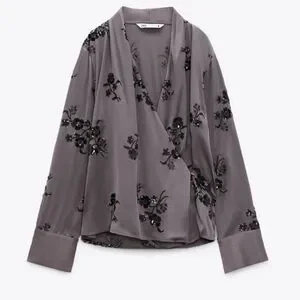 Elegant blouse with black floral embellishments. Features a wrap design. Perfect for evening wear.