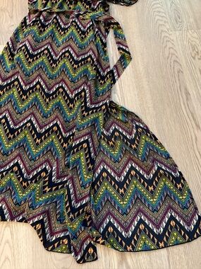 Lightweight midi dress with adjustable spaghetti straps. Vibrant chevron print in navy, teal, mustard, burgundy and cream. Flowy ruffle detail at the bodice. Tie waist for a flattering fit.