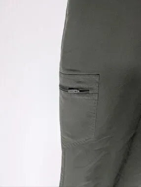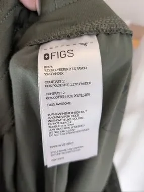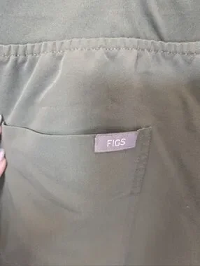 FIGS scrub pants in olive green. Front pocket with branded FIGS tag. Soft, durable fabric. Timeless utility look.