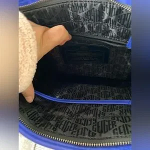 • Features: Zip top closure, signature eagle head with crystals, interior zip pocket, gold foil logo, faux leather base for durability.