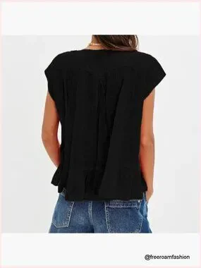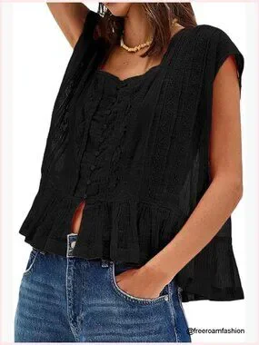 Semi Sheer Blouse Lace Trim Button Down Short Sleeve Round Neck Y2K Top