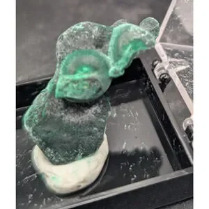 Natural malachite mineral specimen featuring rich green color and classic botryoidal surface texture. Displayed in a black mineral specimen box with a clear hinged lid for protection and easy viewing. The piece shows layered green tones and organic formations typical of malachite, making it great for collectors, geology students, or educational displays. Disclaimer: I am not a rock or mineral expert; details are based on visual characteristics. Please review photos to confirm condition and formation.
