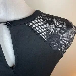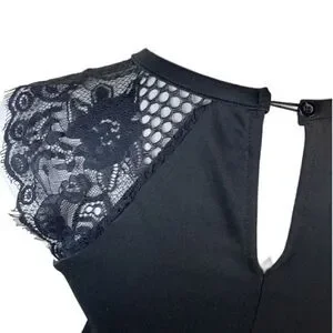 ELODIE SHEER FLORAL SHOULDER, sleeveless black DRESS, Women’s small. It’s a polyester and spandex blend giving it some stretch with a form fitting. Really a beautiful black dress with a gorgeous sheer and floral top. In great shape even though it is lightly used. Single stretch button open back of dress. The inner tag shows some wear but the shell and inner lining are mint.