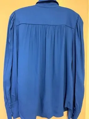 Elegant royal blue blouse with a tailored collar and long sleeves. Soft drape and subtle pleating at the shoulders for a polished look. Versatile top that pairs easily with workwear or weekend outfits. Bright blue color adds a refined pop to your wardrobe. Chest 43”. Back length 28”