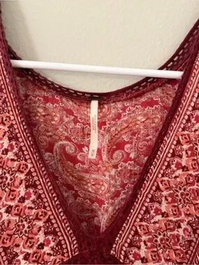 Sleeveless dress with deep V-neck and lace trim. Paisley and geometric print in warm tones. Lightweight, flowy silhouette. Casual boho styling.