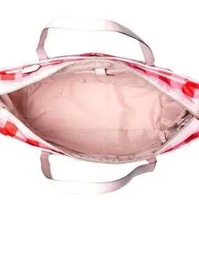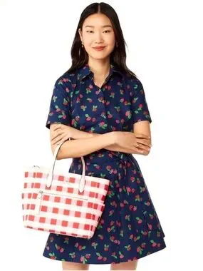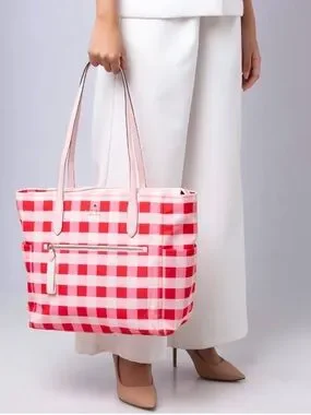 kate spade gingham tote in pink and red. Features front zip pocket and leather top handles.