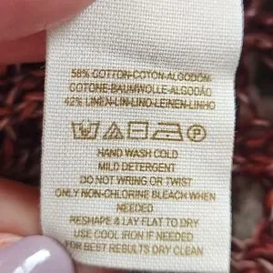 Mixture of large open knit and tighter knit, long sleeves that bell slightly at the cuff. Crew neck, super soft cotton/linen blend, multicolor knit of blue, dark pink, white, tan, and purple.