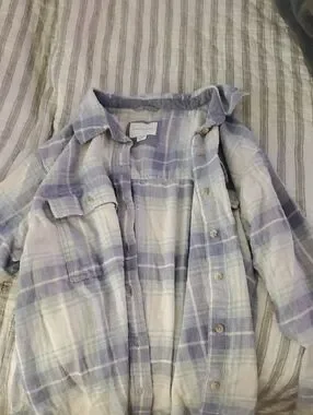 Soft plaid button-up shirt in light purple and white tones. Casual relaxed fit. Front pockets and button closure. Versatile layered piece.