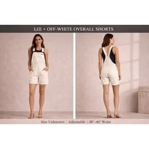 Lee white denim overall shorts in a comfortable cotton-rich stretch blend. These classic bib overalls feature adjustable shoulder straps with branded metal hardware and a multi-pocket design including a signature chest pocket. The side button closures and belt loops provide a functional, tailored fit while the off-white hue offers a clean, minimalist aesthetic perfect for summer casual wear or boho-inspired styling.