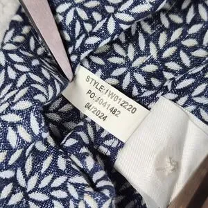 Tags and codes: Inner labels list 100% linen composition, RN 134578, and style code 1W012220 with PO 3041482 and date 04/2024.