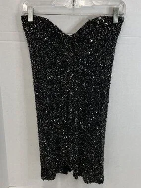 This strapless style features dense black sequin bead embellishment with a subtle gunmetal shimmer that catches light beautifully. The structured sweetheart neckline with a slight twist detail enhances the bust, while built-in cups provide support for a secure, flattering fit.