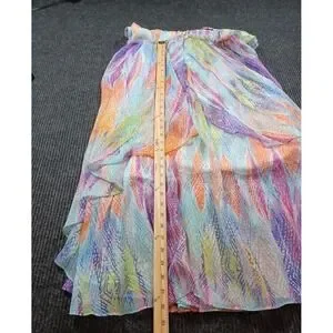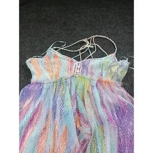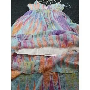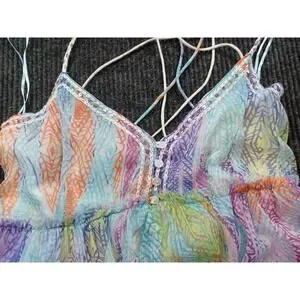 This Free People Multi Color Maxi Dress with button front and crisscross straps is a stunning piece perfect for a casual occasion, with its sleeveless design, crisscross straps, and layered accents. Made from a blend of rayon and cotton, this long dress features a beautiful multi color abstract design, embodying a bohemian and colorful theme. The backless feature adds a touch of allure, making it ideal for the summer and spring seasons. Designed with a pullover closure, this dress is machine washable for easy care and is available in a size M, catering to women looking for a fairy-like and stylish look.