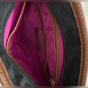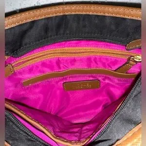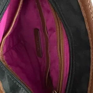 Sleek and timeless, this Michael Kors black and brown crossbody bag is the perfect blend of function and fashion. Crafted with a smooth nylon body, rich leather trim, and detailed with signature MK gold hardware, it’s lightweight yet structured for effortless everyday wear. The vibrant fuchsia interior adds a playful pop of color, featuring multiple compartments and a secure zip closure.