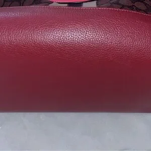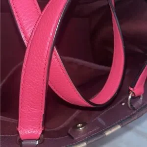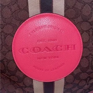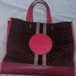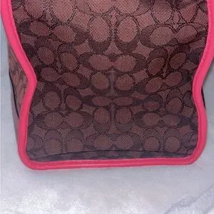 Coach tote in brown signature canvas with bright pink leather trim. Central vertical stripe and round embossed logo plaque. Structured silhouette with dual top handles. Perfect for daily use. ** I took as many pics as I could to show no visible signs of wear. No scratches or stains on the outside. 2 stains inside. Otherwise very clean. It is missing the longer strap. Smoke and pet free home.** Free GWP.
