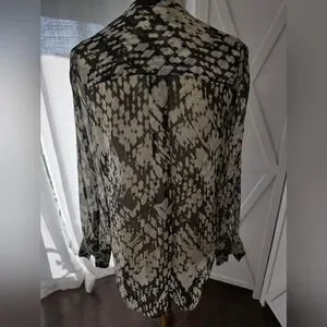 Elevate your wardrobe with this chic black and cream 100% silk button down basket weave print blouse from Vince. It has long sleeves, a pleated back, two front chest pockets that would be great for work at the office or a special occasion. Longer length with side split hem that can be worn as a tunic or tucked in. Good pre-owned condition.