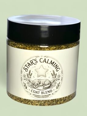 Disclaimer: Store brewed liquid in the fridge for up to a week. For topical pet use only. If skin is broken, bleeding, or severely irritated, consult your veterinarian.Star's Calming Coat Blend for dogs. Features a soothing and nourishing formula.