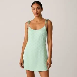 This dress features a scoop neckline, relaxed, mini silhouette, straps with tie closures, V-neckline at back, zip