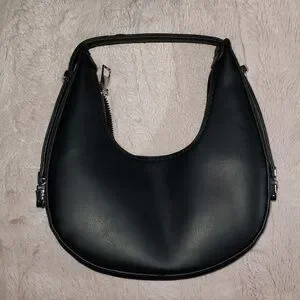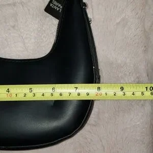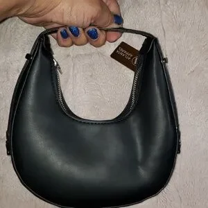 This is a small black bag that can he held by hand or on your arm. It is faux black leather with black nylon lining. The hardware is all silver. It is new and has never been used. Measurements are in photos.
