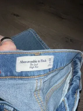 High-rise dad-style jeans from Abercrombie & Fitch. Light blue denim with contrast gold stitching. Casual, relaxed fit. Easy to pair with many tops.