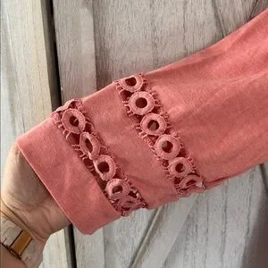 Stylish coral V-neck top featuring lace detail on sleeves. Perfect for casual wear.