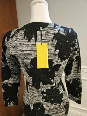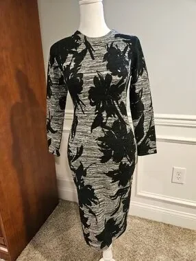 Elegant black floral print on a gray knit background. Fitted midi silhouette with long sleeves for a polished look. Soft, stretchy fabric provides comfortable all-day wear. Versatile dress for work or evening events. Size SMALL. New With Tags. 62%viscose. Polyester and elastane.