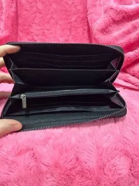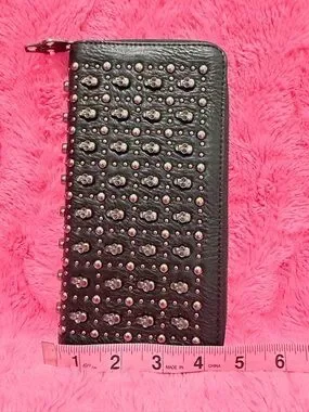 Sleek black zip-around wallet with all-over skull studs for edgy style. Durable faux leather exterior with metal stud detailing. Compact yet functional design that keeps essentials organized. Perfect for adding a bold accent to any outfit.