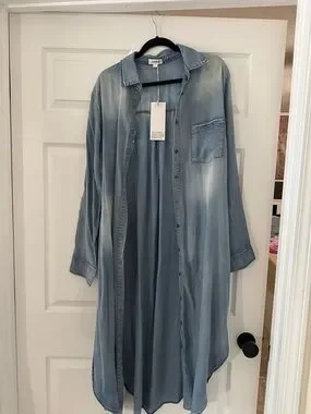 Caslon light blue denim shirt dress jacket. Lightweight, relaxed fit with button-front and chest pocket. Versatile layering piece for casual outfits. Soft, faded light blue color adds a worn-in look.