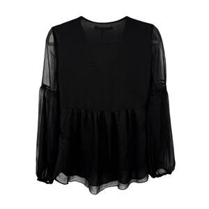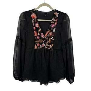 WHBM Black Floral Embroidered Chiffon Top XS Boho Fairy Bell Sleeve V Neck Sheer