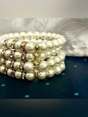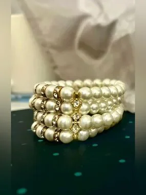 Design and Materials: The bracelet typically has three strands of high-quality faux pearls. It is accented with clear rhinestone spacers, often set in gold-tone metal, which adds an elegant look