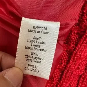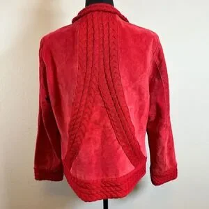 Bold and unique, this Coldwater Creek women's jacket is crafted from 100% red suede leather with striking knit trim accents at the collar, cuffs, hem, and back. Designed with a single button closure and tie detail, it blends classic tailoring with cozy sweater-like elements for a standout look. Fully lined in polyester with a soft drape, this jacket is perfect for adding a pop of color to your fall and winter wardrobe. The leather could benefit from a professional cleaning, but overall it is in good condition with no major flaws—an elegant statement piece with timeless charm.