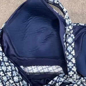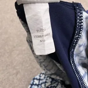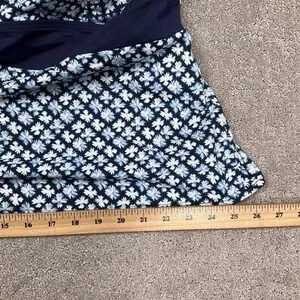 blue and white floral geometric print with a supportive shelf bra and adjustable cross-back straps. Designed with a flattering twist-front sweetheart neckline and a solid navy contrast band under the bust, this swim top provides both style and comfort for a day at the pool or beach. The high-quality stretch fabric ensures a secure fit while the flared hem offers a relaxed silhouette.
