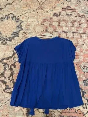 Rich royal blue blouse with colorful embroidered yoke. Short sleeves and lightweight, airy fabric. Decorative tassel ties at the hem. Effortless boho look for everyday wear. The brand label tag is falling off, but that could be easily fixed by sewing a few stitches.